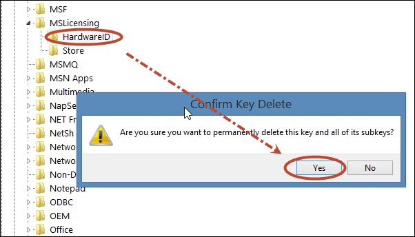 | หลังจากนั้น ให้ท่านคลิกไปที่ HKEY_LOCAL_MACHINE\Software\Microsoft\MSLicensing ท่านจะสังเกตุเห็นว่าข้างใต้โฟลเดอร์ MSLicensing มี Sub Folder ชื่อ HardwareID และ Store แสดงอยู่ตามรูป ให้ท่านลบทั้ง 2 รายการนี้ออกครับ | |